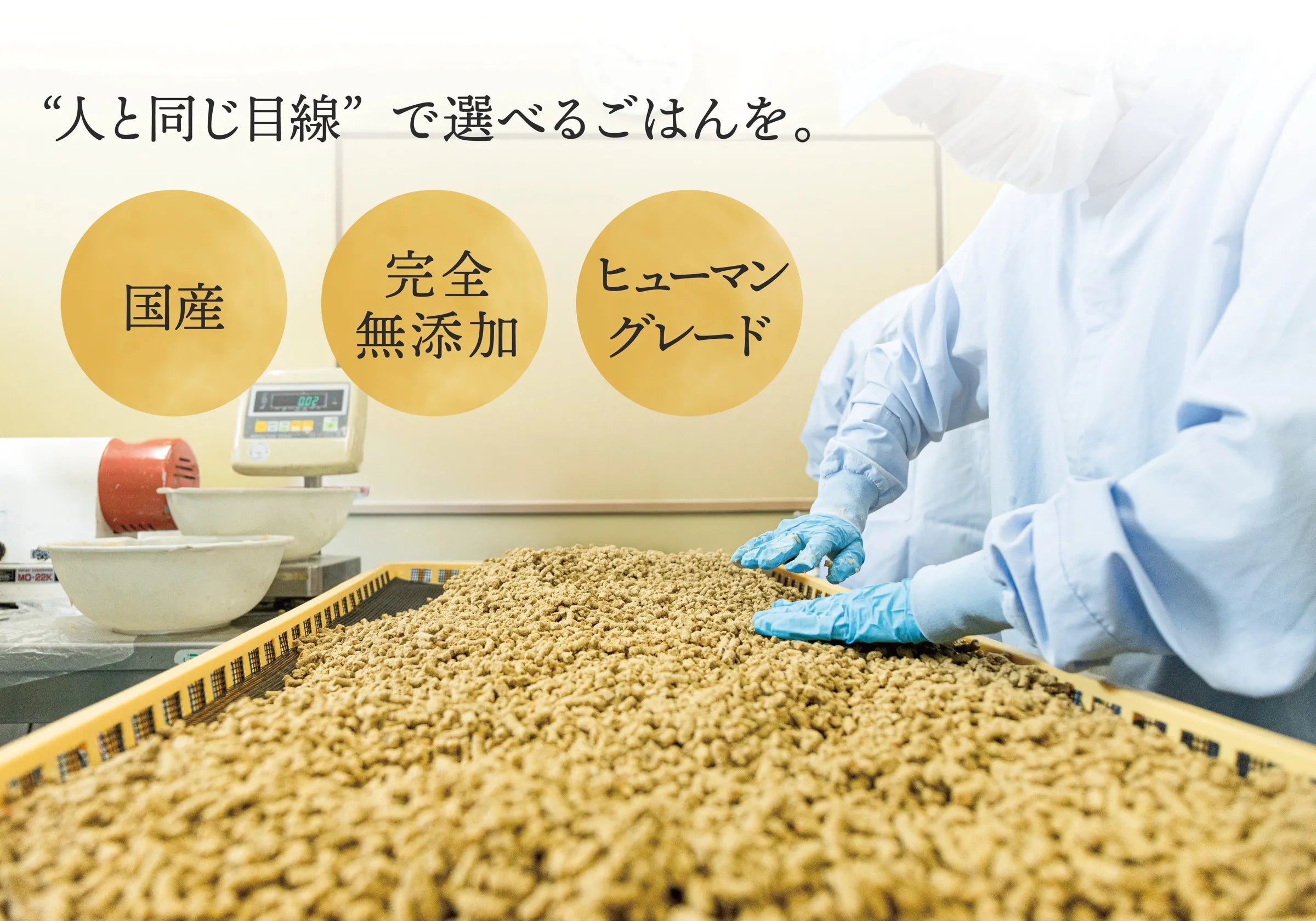 最愛の家族である愛犬には、ヒトが食べても安全な品質水準の原材料だけを厳選しています。