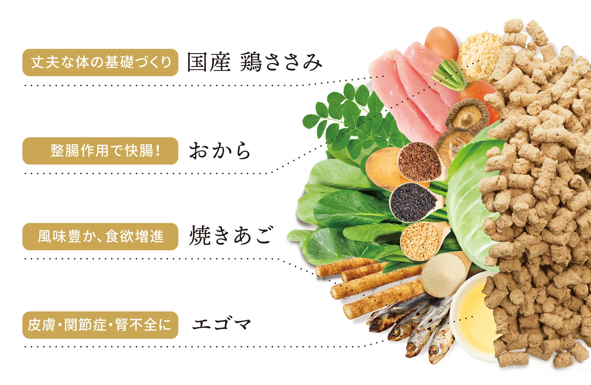 活発な成犬からシニア犬まで。良質なたんぱく源となる鹿肉をはじめ、皮膚や関節、腎臓機能に欠かせない必須脂肪酸を含むエゴマ、食物繊維たっぷりのおからなど。食材から、さまざまな栄養が摂れるフードを作りました。原材料名は100%開示しています。