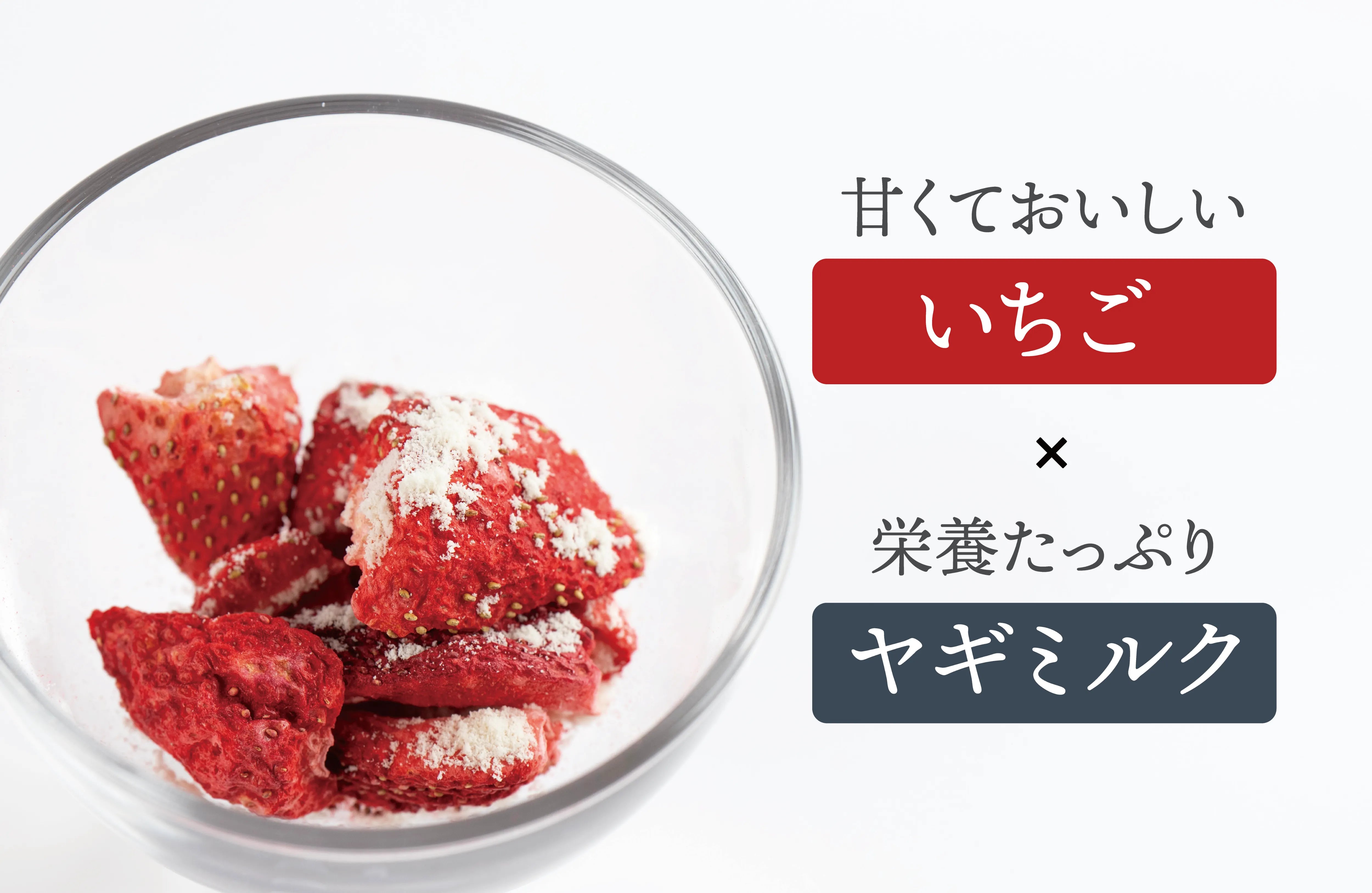 フリーズドライのいちごに、ヘルシーな脱脂のヤギミルクをまとわせました。おやつとして楽しむのはもちろん、ぬるま湯に溶いて、いちごミルクとしても楽しめます。