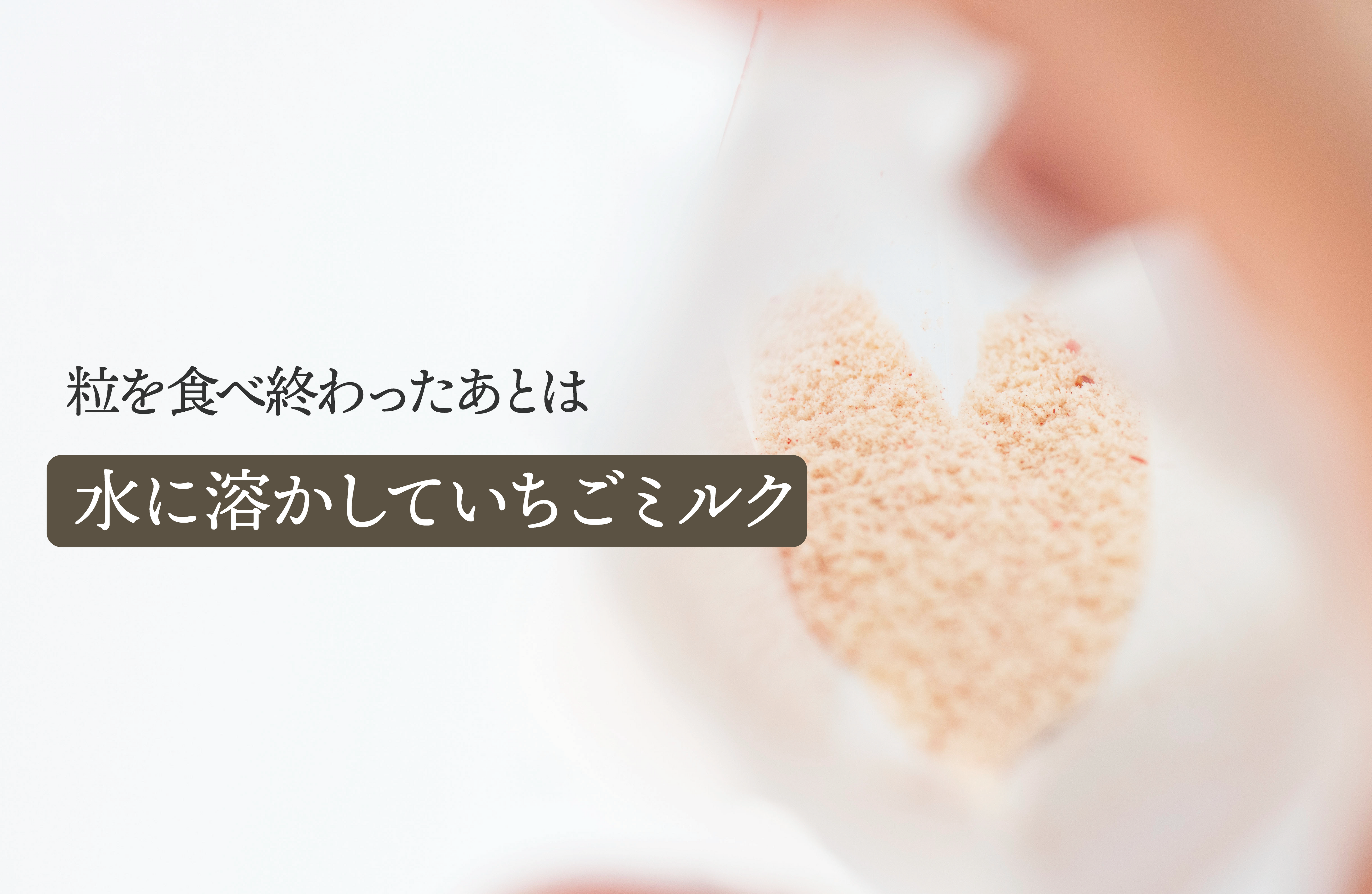 いちごの粒を食べ終わった後には、底にたまったヤギミルクの粉を水に溶かして「いちごミルク」にして飲むことも!