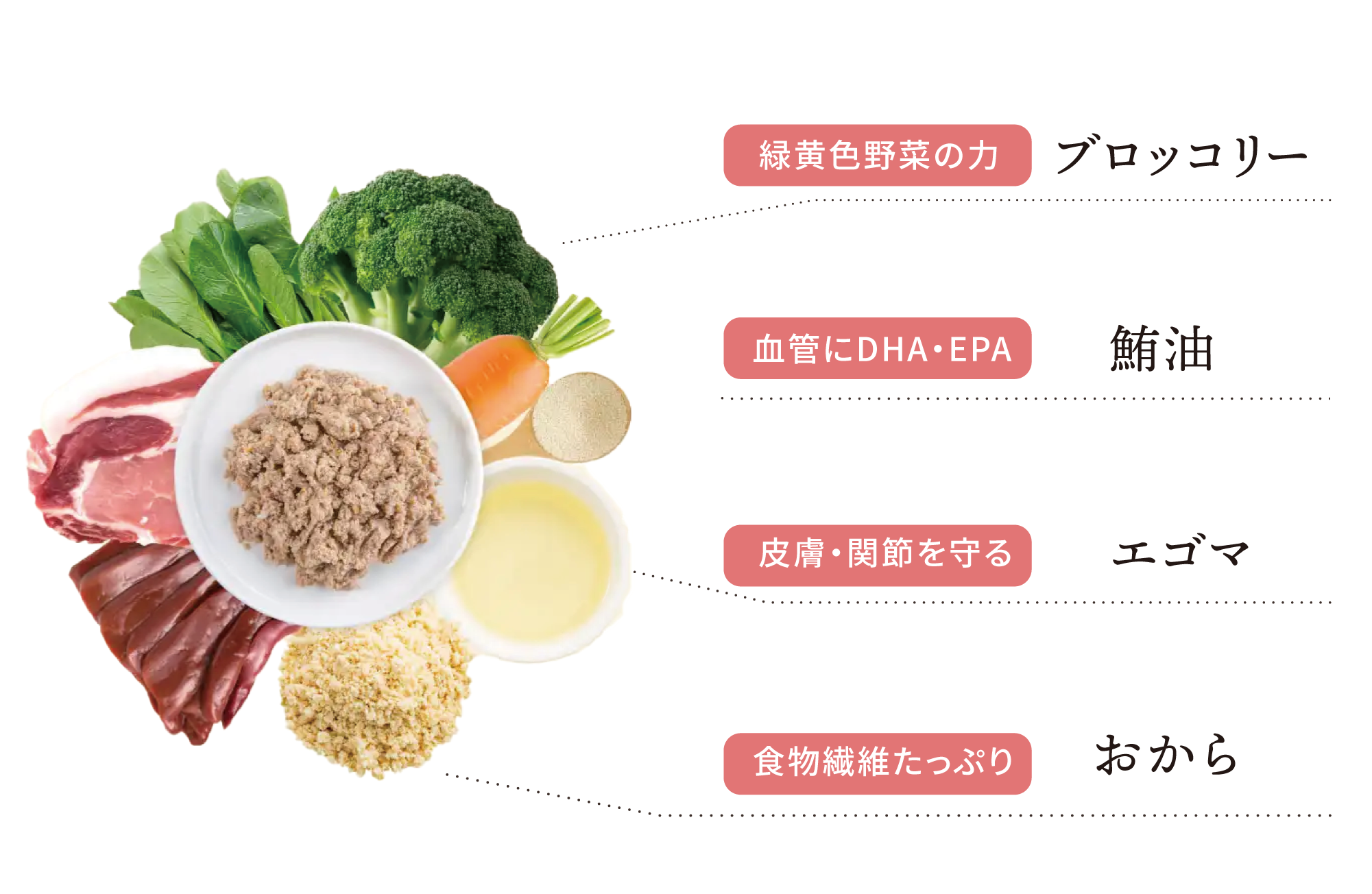 ビタミンやミネラル含有量トップクラスのブロッコリーや、オリゴ糖・食物繊維たっぷりのおから、皮膚や神経、血管を守るDHA・EPAが豊富な鮪油など。バディバディは乳酸菌だけでなく、さまざまな栄養を含む食材たちも取り入れ、愛犬の健康を守ります。