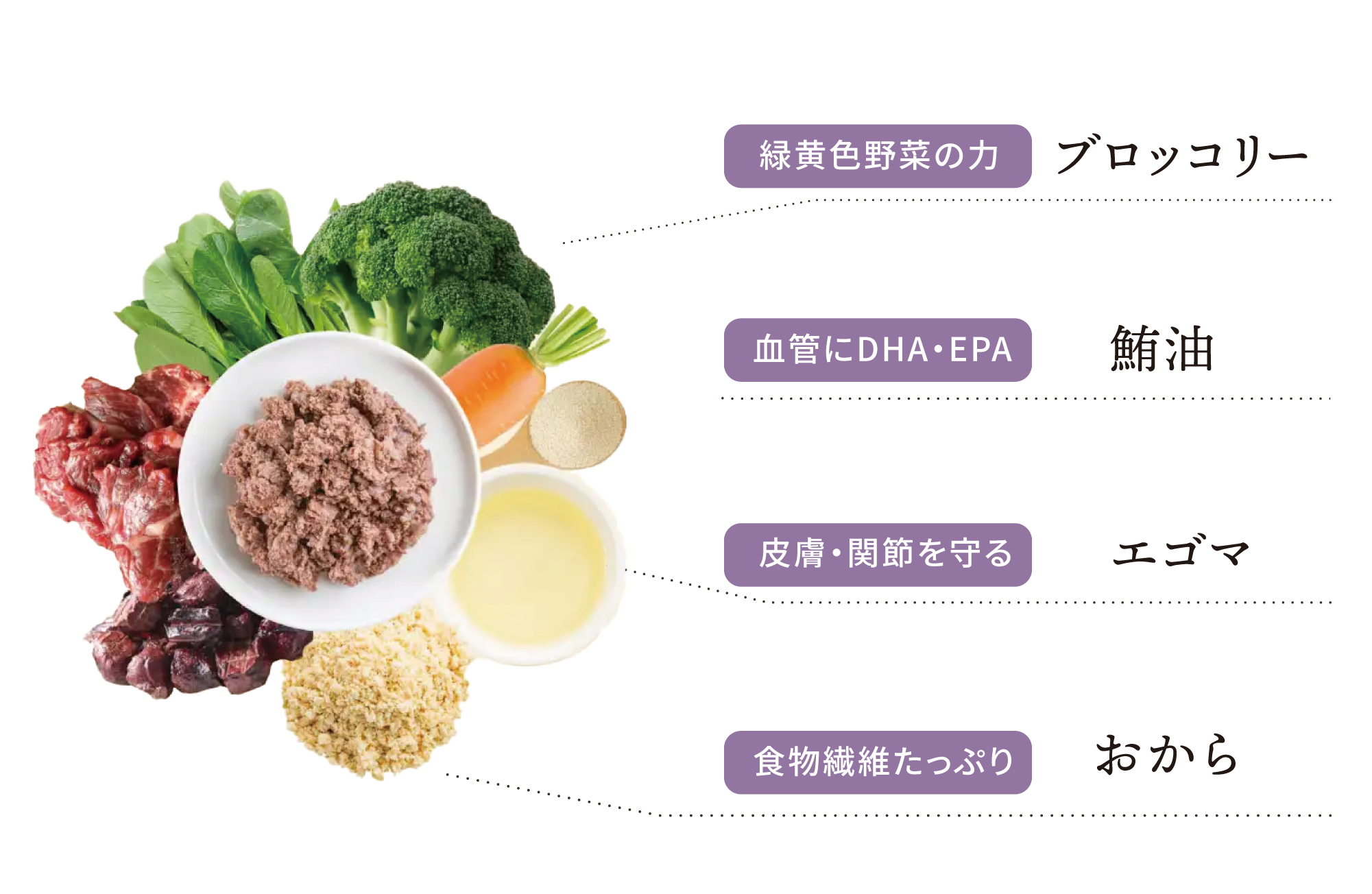 ビタミンやミネラル含有量トップクラスのブロッコリーや、オリゴ糖・食物繊維たっぷりのおから、皮膚や神経、血管を守るDHA・EPAが豊富な鮪油など。バディバディは乳酸菌だけでなく、さまざまな栄養を含む食材たちも取り入れ、愛犬の健康を守ります。